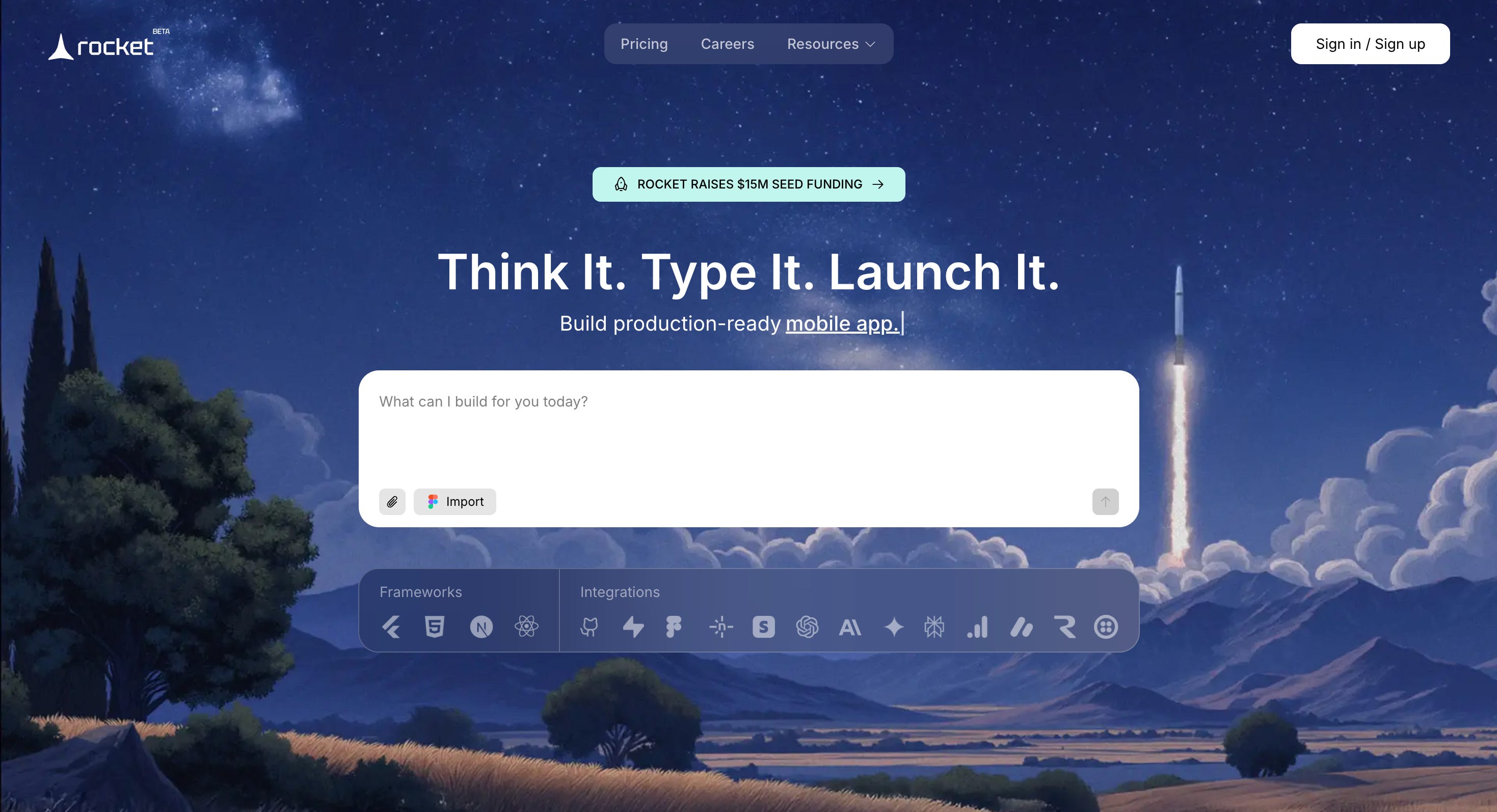 只要用自然語言描述你的願景,Rocket.new 會主動「研究市場」、「補齊沒想到的關鍵功能」、設計 UI/UX、甚至撰寫對外行銷文案。⇨ 一條龍打造——從前後端到文案全部交給 AI