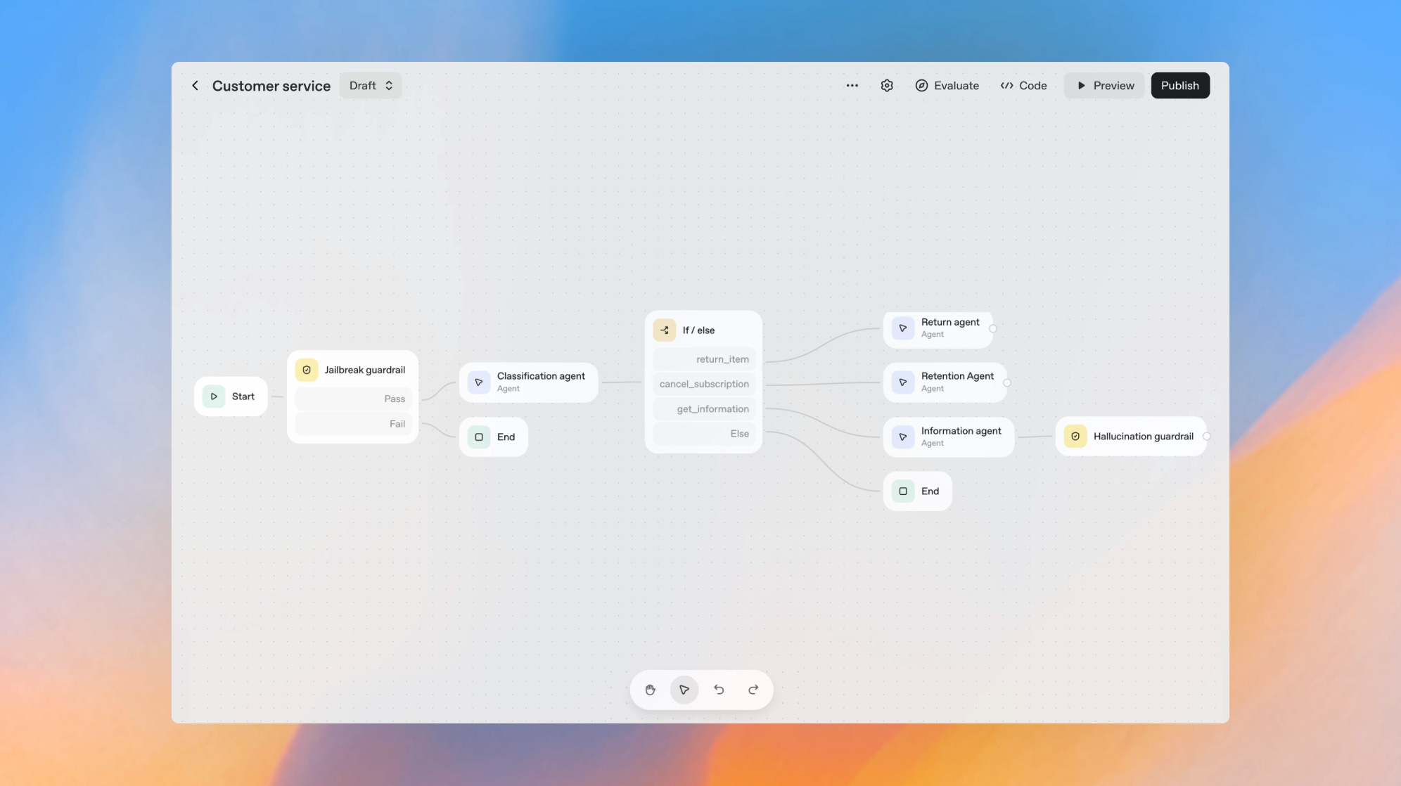 內建 Guardrails 可自動識別敏感訊息、偵測異常互動,確保AI流程安全。Evals 評測工具可針對每次產出自訂評分、持續追蹤運作效能,還能根據你的標準自動調整策略,讓AI 代理人越用越懂你。