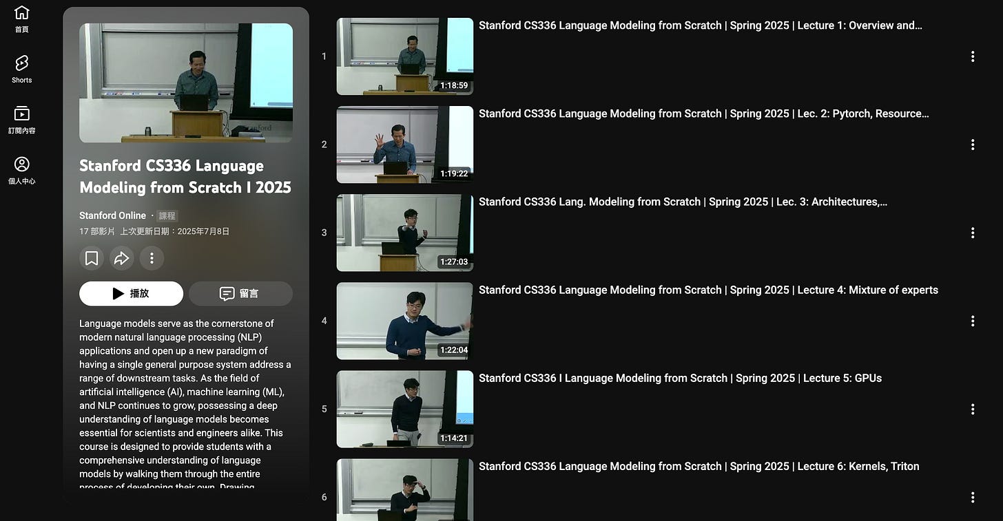 史丹佛大學近期公開了其研究所課程《CS336: Language Modeling from Scratch》的完整教學影片與講義。這門課原本學費高達 7,570 美元(約台幣 24.5 萬),如今免費釋出全套 17 集、約 20 小時的內容。不同於市面上多數教導「如何使用 API」的課程,這是一門專注於「如何從頭打造模型」的底層技術課。