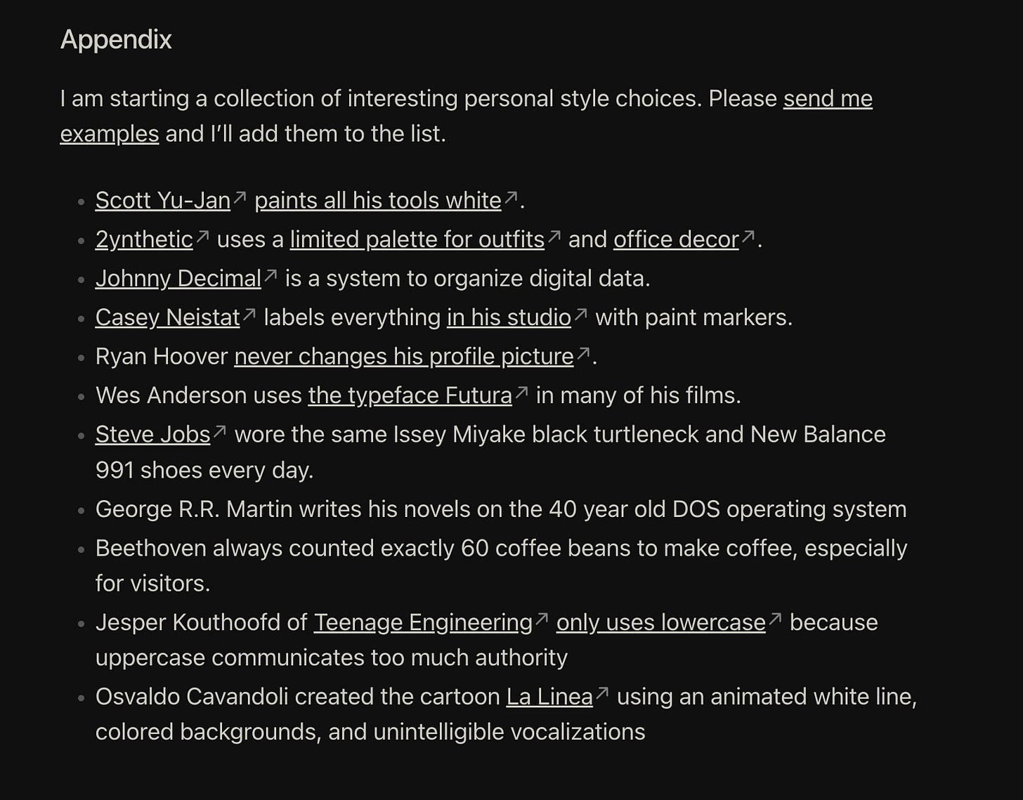 Steph Ango 說:風格是一項經久耐用的投資。它讓你判斷何時該遵守規則,何時又該打破它;透過約束形式,你能更高效地產出內容。