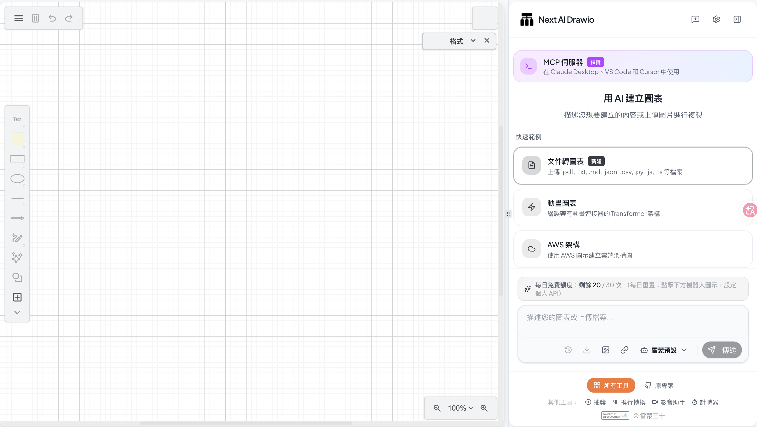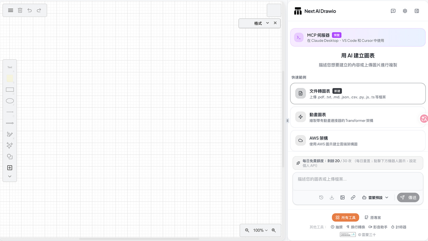 對開發者來說,Next AI Drawio 能串接 MCP(Model Context Protocol),在編輯器中直接呼叫 AI 產圖,無需切換視窗。對一般創作者,雷蒙架的線上版支援語音輸入,直接說「我要畫一個電商結帳流程」就能產出初稿。⇨ 免費線上版 + 開源可自架